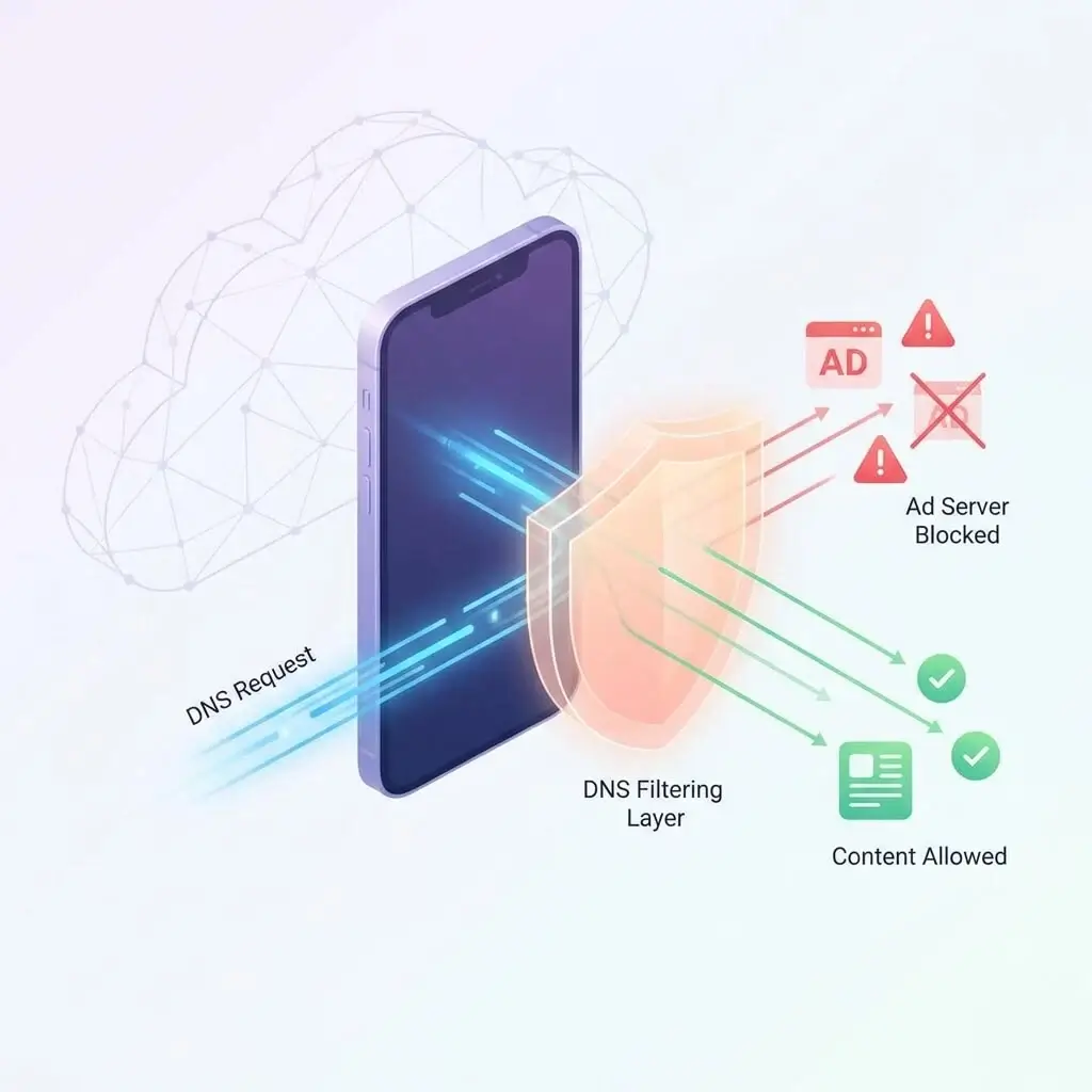 DNS level filter: Filters out ad-serving domains even before the connection occurs, deals with trackers, analytics scripts, and display ad networks