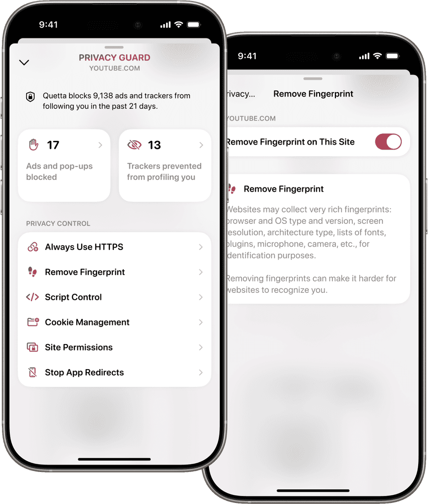 Quetta does more than simply hinder trackers โ it safeguards your online privacy and security across the board. Make sure your data is safe from unsolicited access across any website, app, or individual.