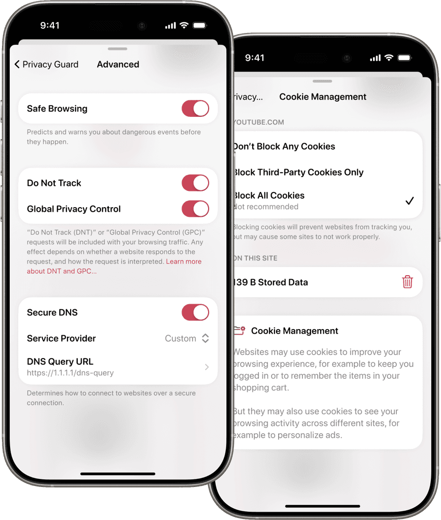 Advanced cookie management and fingerprint removal give you control over your digital footprint.
